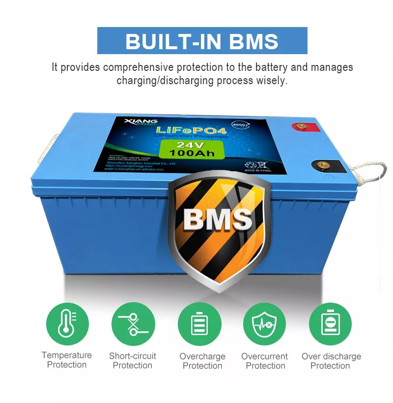 【100% Protection 】XIANGHAO LiFePO4 battery has built-in BMS to protect it from overcharge, over-discharge, overcurrent, and short circuit with excellent self-discharge rate. Operating Temp: Charge: 0°C~50°C; Discharge: -20°C~60°C. Our battery is IP65 waterproof, setting you free from worrying to install indoors or outdoors.